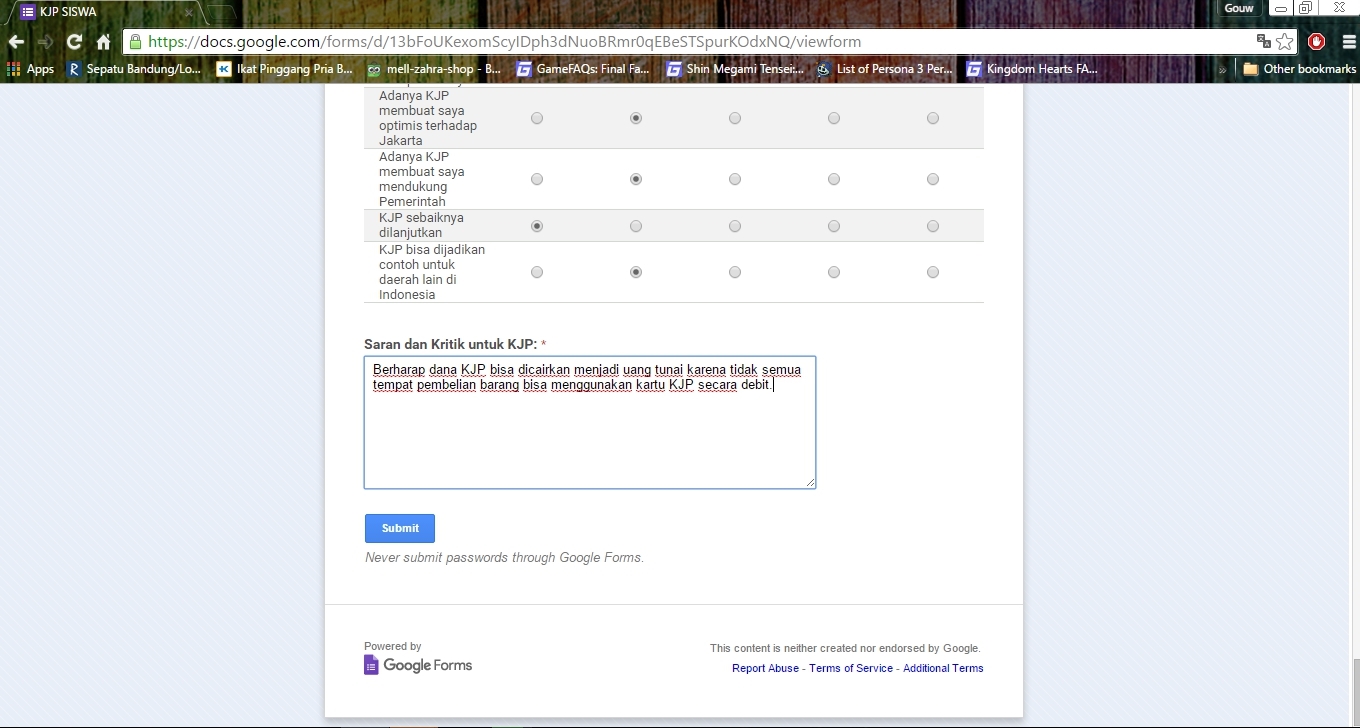 Wawancara terlaksana dengan baik. Semua peserta KJP juga kooperatif karena mau menjawab setiap pertanyaan yang kami berikan kepada mereka. Dari jawaban yang mereka lontarkan kepada kami, sebagian besar dari mereka menginginkan program KJP dapat terus dilakukan dan program ini diharapkan terus menjadi lebih baik setiap tahunnya. Ada pula yang meminta agar dana KJP yang diberikan dapat dicairkan agar mereka bisa melakukan pembelian dari dana tersebut kapan saja dan dimana saja. Hal yang paling utama mereka butuhkan dari dana KJP ini adalah dana untuk ongkos kendaraan mereka untuk pulang dan pergi sekolah.